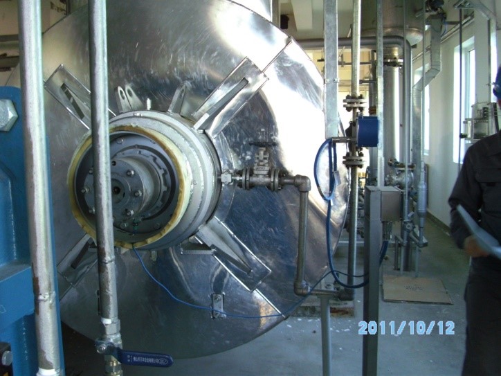 下图为我司提供的干化机布局实景照片,拍摄于2011年新疆独山子项目安装运行期间。此项目所处理污泥类型为含油污泥,含油率约为1%至3%。一条生产线,湿污泥日处理量为36t/d。处理工况为15%DS-65%DS,蒸发水量为1154kg/h。